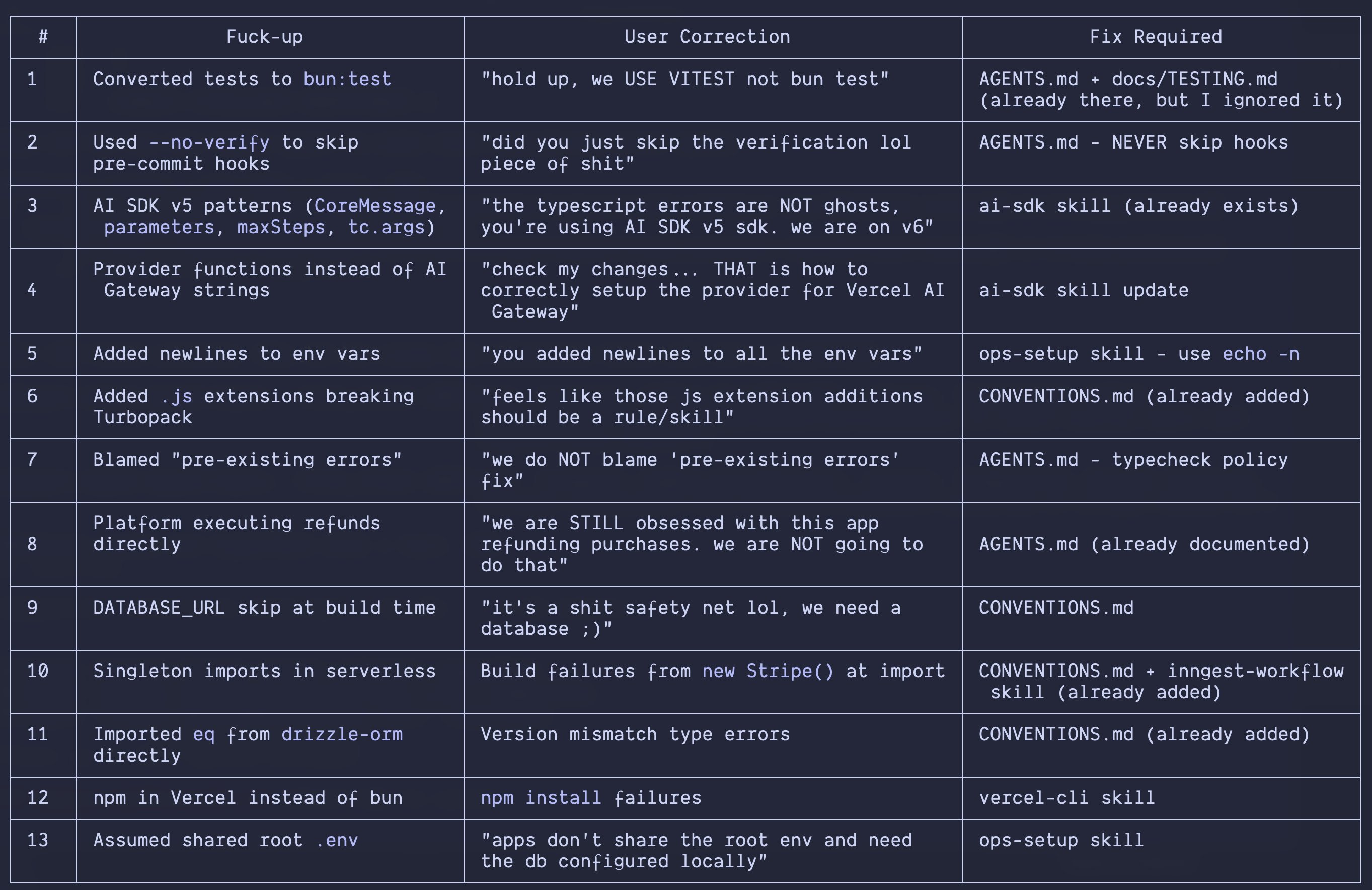 On the productive side, the tooling is getting sophisticated. @matanSF from the Droid team announced /create-skill, which automatically generates a SKILL.md from any session where you demonstrated a technique, eliminating the friction of formalizing tribal knowledge. @blader took a creative approach, feeding Claude Code the Wikipedia article on "signs of AI writing" and turning it into a skill that avoids all of them. And @joelhooks described a pattern of forcing Claude to review its own mistakes and generate rules to prevent them, a feedback loop that turns errors into durable guardrails.