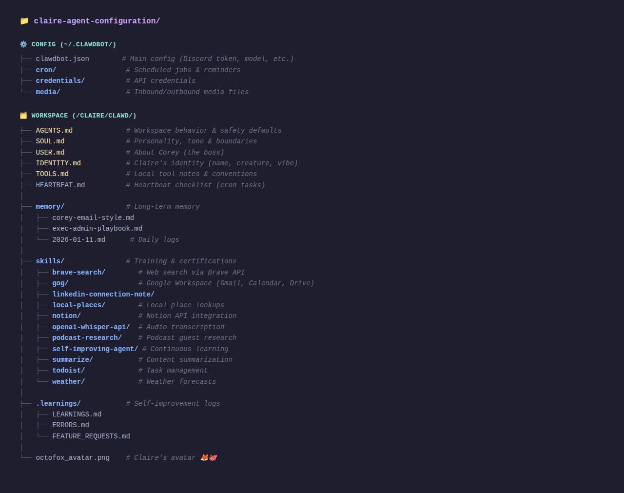 The single biggest theme today was the maturation of agent infrastructure. Not agents as a concept, but agents as engineered systems with real folder structures, memory persistence, and operational patterns. @GanimCorey shared the actual directory layout of a production "AI employee" and the design philosophy is immediately recognizable to anyone who has built software systems: "Config = what they can access. Workspace = how they think and act. Memory = what they remember. Skills = what they're trained to do." The inclusion of a self-improvement skill that logs learnings and errors is the kind of detail that separates toy demos from production systems.