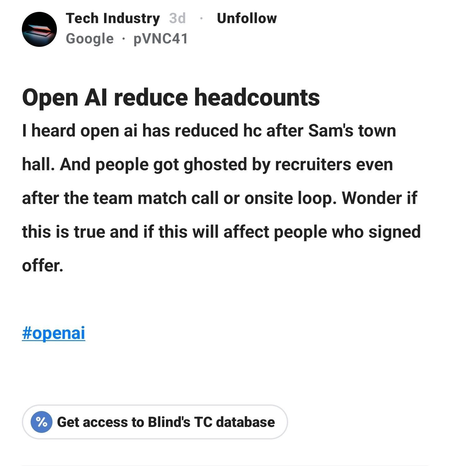 [๋ฏธ๊ตญ ๋ธ๋ผ์ธ๋ ๊ตฌ๊ธ ์ง์์ ๊ธ ๋ฒ์ญ] ์ ์ํธ๋จผ์ ํ์ดํ ๋ฏธํ ์ดํ OpenAI๊ฐ ์ธ์์ ๊ฐ์ถํ๋ค๋ ์์์ ๋ค์์ต๋๋ค. ์ฌ์ง์ด ํ ๋งค์นญ(Team Match)์ด๋ ์จ์ฌ์ดํธ ๋ฉด์ (Onsite Loop)์ ๋ง์น ํ์๋ ๋ฆฌํฌ๋ฃจํฐ๋ก๋ถํฐ ์ฐ๋ฝ์ด ๋๊ฒผ๋ค๋ ๋ถ๋ค์ด ์๋ค๊ณ ํ๋ค์. ์ด๊ฒ์ด ์ฌ์ค์ธ์ง, ๊ทธ๋ฆฌ๊ณ ์ด๋ฏธ ์คํผ๋ ํฐ์ ์๋ช ํ ์ฌ๋๋ค์๊ฒ๋ ์ํฅ์ด ์์์ง ๊ถ๊ธํฉ๋๋ค.
