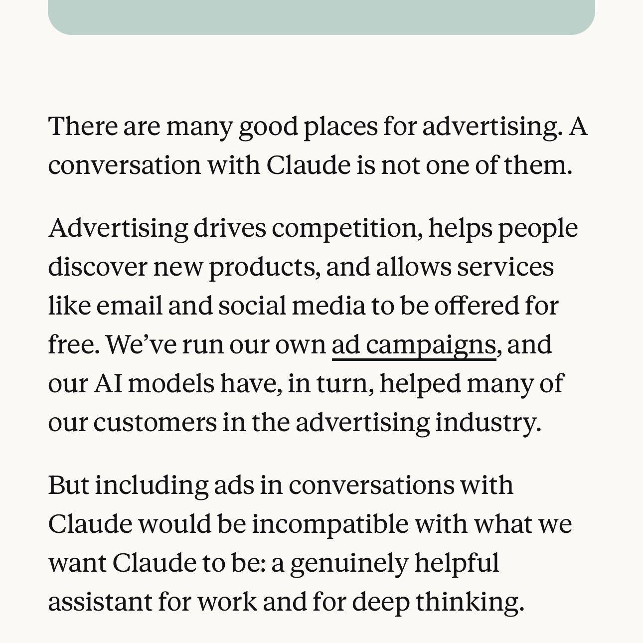 Claude is built to be a genuinely helpful assistant for work and for deep thinking. Advertising would be incompatible with that vision. Read why Claude will remain ad-free: https://t.co/Dr8FOJxINC
