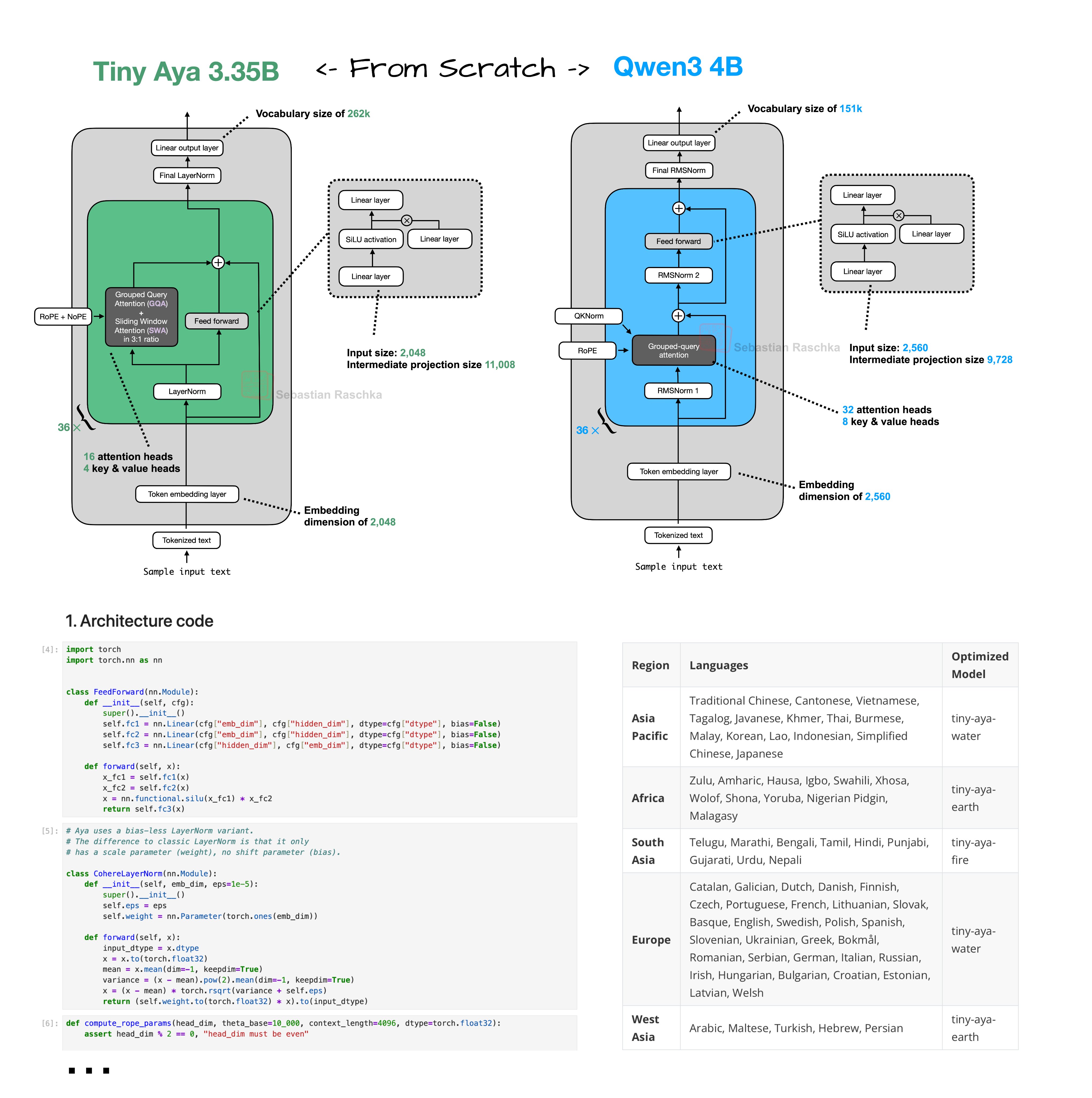 The model ecosystem saw interesting movement on the smaller, more practical end of the spectrum. @rasbt did a from-scratch reimplementation of Tiny Aya, a 3.35B parameter model that he called the "strongest multilingual support of that size class." His architectural breakdown highlighted several noteworthy design choices: parallel transformer blocks that compute attention and MLP from the same normalized input, a 3:1 local-to-global sliding window attention ratio similar to Arcee Trinity, and a modified LayerNorm without bias parameters rather than the more common RMSNorm.