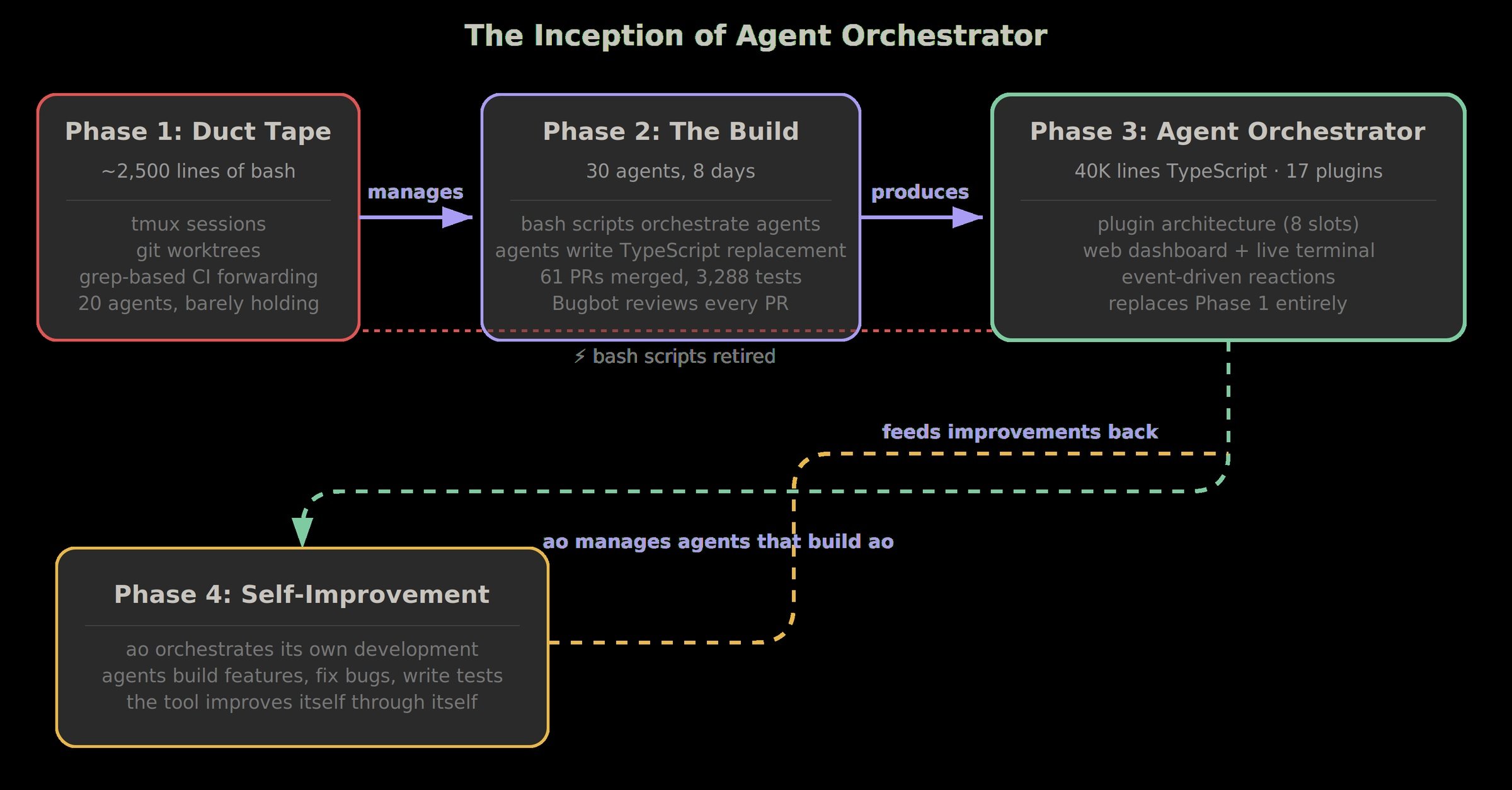 We just open-sourced the system we use to manage 30 parallel AI coding agents per person. 40K lines of TypeScript. 3,288 tests. 17 plugins. Built in 8 days — by the agents it orchestrates. Yes, we used Agent Orchestrator to build Agent Orchestrator. Some numbers: → 500+ agent-hours in 24 human-hours (20x leverage) → 86 of 102 PRs created by AI (84%) → After Day 4, I stopped writing code entirely Spawn agents. Step away. Ship faster.