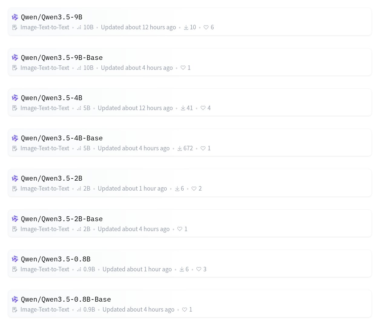 NEW OPENSOURCE MODELS INCOMING We're getting four new Qwen 3.5 models today > Qwen 3.5 9B > Qwen 3.5 4B > Qwen 3.5 2B > Qwen 3.5 0.8B Everybody is starting to say Buy a GPU ;) https://t.co/VvjbeYRIgB