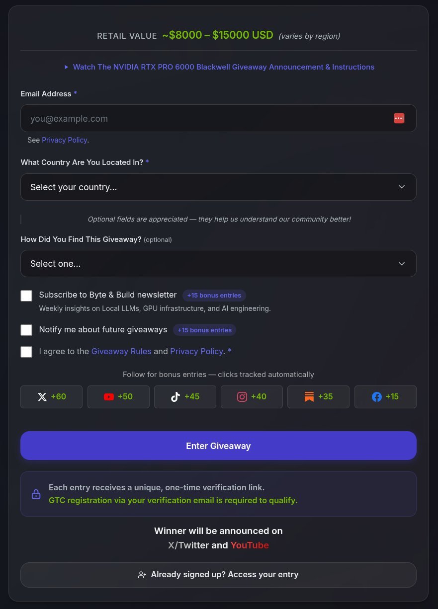 - @TheAhmadOsman is giving away an RTX PRO 6000 (96GB VRAM, ~$15K) sponsored by NVIDIA, tied to GTC 2026 attendance.