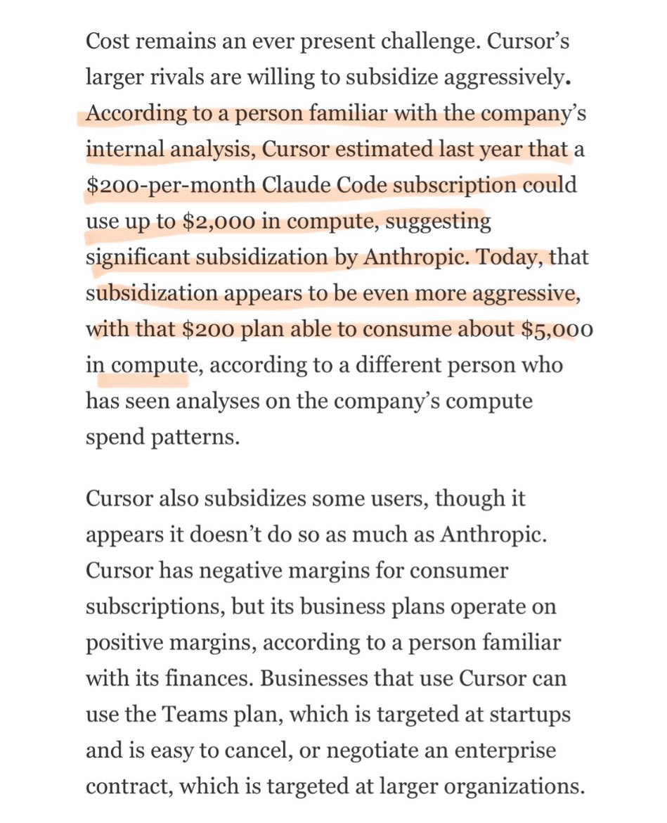 Cursor internal analysis shows how hard Anthropic is subsidizing Claude Code. Last year, a $200 monthly subscription could use $2,000 in compute. Now, the same $200 monthly plan can consume $5,000 in compute (2.5x increase). https://t.co/JFdmzNJirl