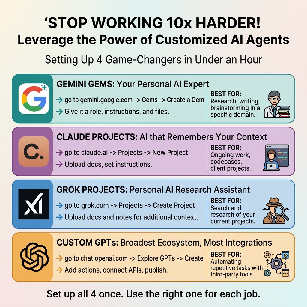 - @minchoi posted a setup guide for Gemini Gems, Claude Projects, Grok Projects, and Custom GPTs, all in one thread.