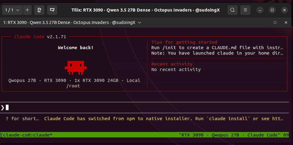 Qwopus on a single RTX 3090. Claude Opus 4.6 reasoning distilled into Qwen 3.5 27B dense, running through Claude's own coding agent (claude code). 29-35 tok/s with thinking mode on. the jinja bug that kills thinking on base Qwen doesn't carry over. harness and model matched. the base model would pause mid task on Claude Code. just stop generating. that's why i ran it through OpenCode, which handles stalled states automatically. this distilled version doesn't stall. it waits for tool outputs, reads them, selfcorrects when something breaks, and keeps going. i gave it a benchmark analysis task. went 9 minutes autonomous. wrote a README nobody asked for. zero steering. video is 5x speed but fully uncut. if you have a 3090, you can run this right now. free. no API. no subscription. opus structured reasoning on localhost. octopus invaders is next. same prompt that base qwen passed in 13 minutes and hermes 4.3 failed on 2x the hardware. i want to see if the distillation changes the outcome or just the style. more data soon.