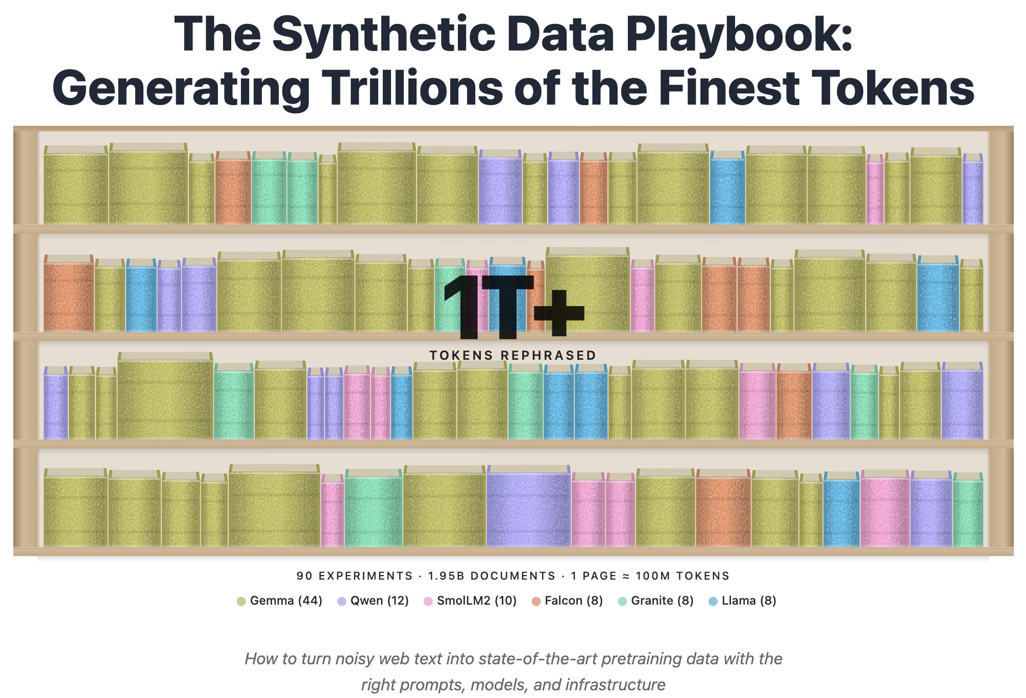 Two significant research drops today. @joelniklaus announced the Synthetic Data Playbook, distilling results from 90 experiments generating over a trillion tokens with 100,000+ GPU hours. The goal: figuring out what makes good synthetic data and how to generate it at scale. This is the kind of systematic empirical work that moves the field forward, and it's notably not coming from a frontier lab.