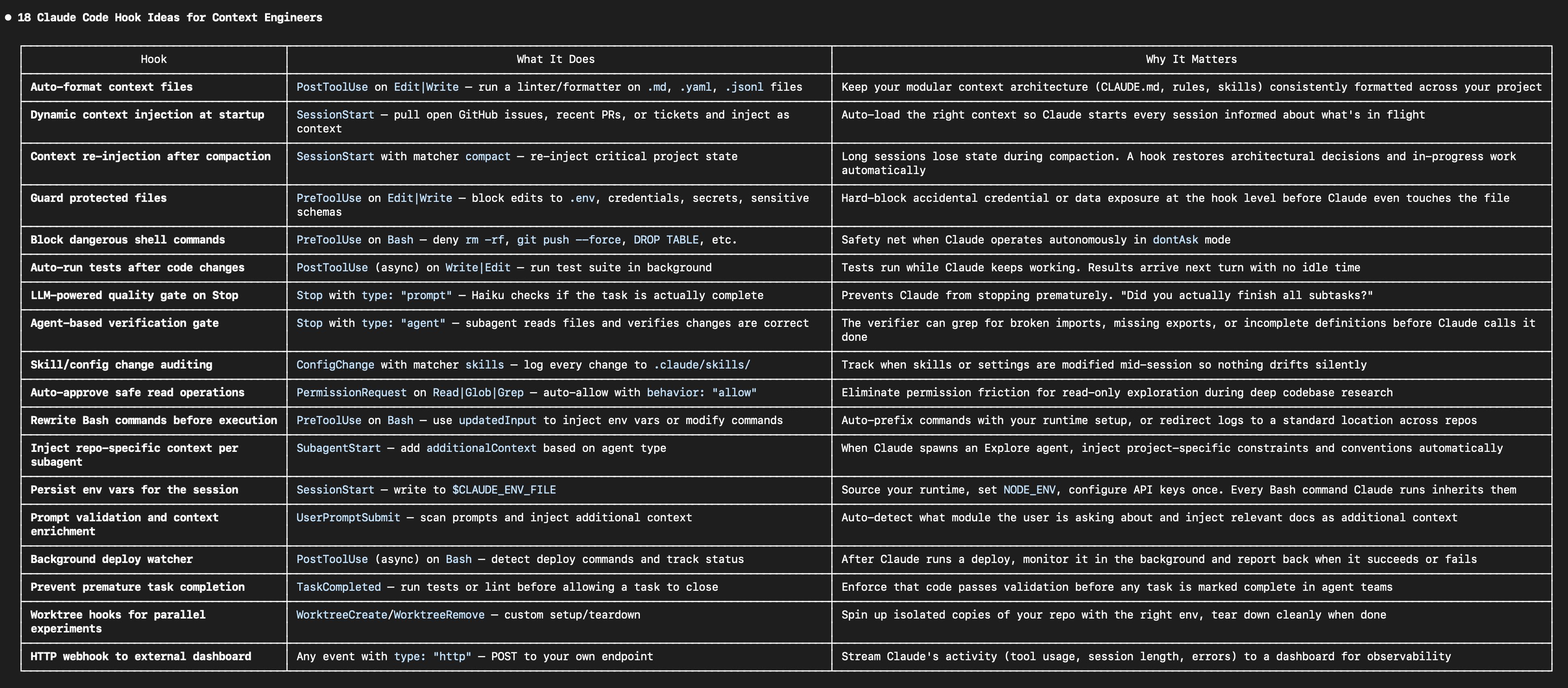 @melvynxdev addressed the safety gap from the developer side, sharing settings.json configurations to block unwanted agent actions when using --dangerously-skip-permissions in Claude Code. Meanwhile, @koylanai compiled 18 practical hook ideas for Claude Code, from auto-formatting context files to quality gates that prevent Claude from stopping early. The institutional and individual responses are converging on the same conclusion: AI coding tools need explicit constraints, whether that's Amazon's senior review mandate or a developer's hook configuration.