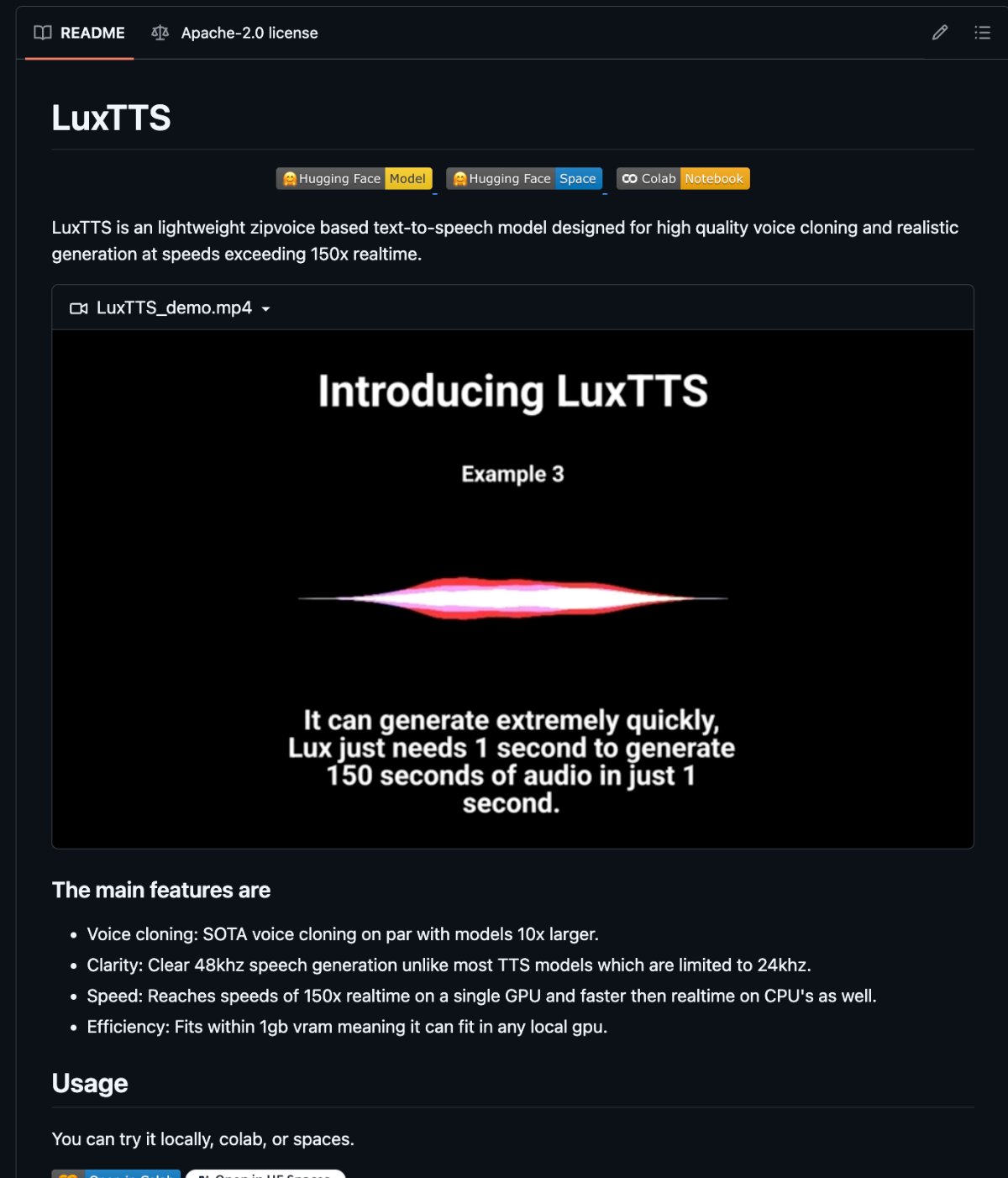 - @hasantoxr highlights LuxTTS, an open-source voice cloner that runs on 1GB VRAM, produces 48kHz audio from 3 seconds of sample, and works on CPU. The "you need ElevenLabs" excuse is officially dead.