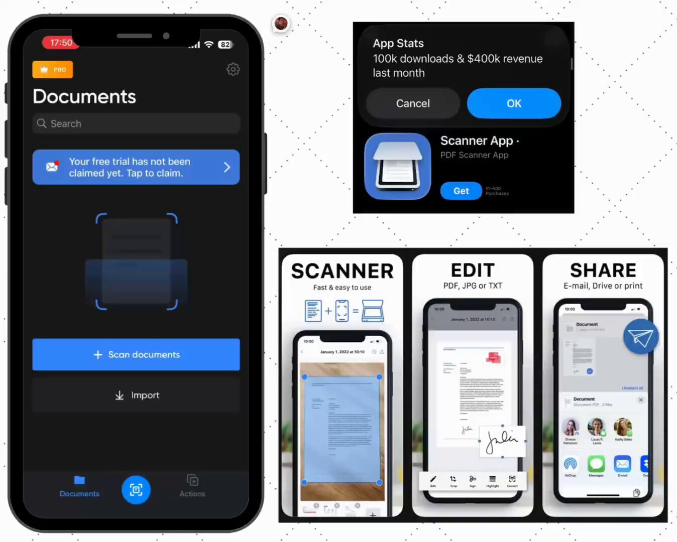 - @adriamatz points out a PDF scanner app making $400K/month at $10/subscription, arguing boring apps print money when Apple Notes does the same thing for free.