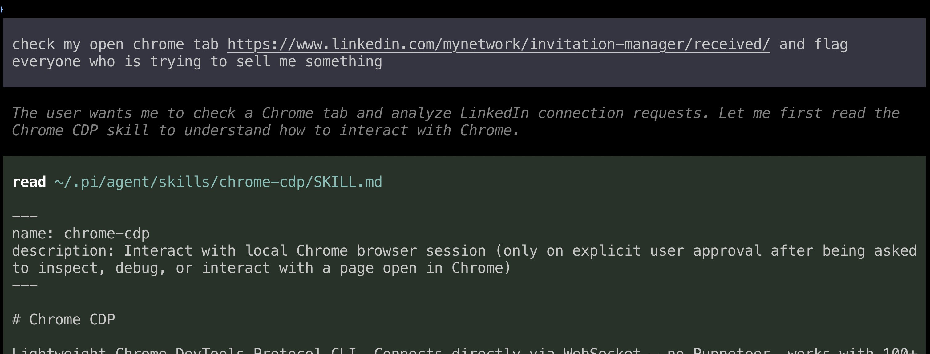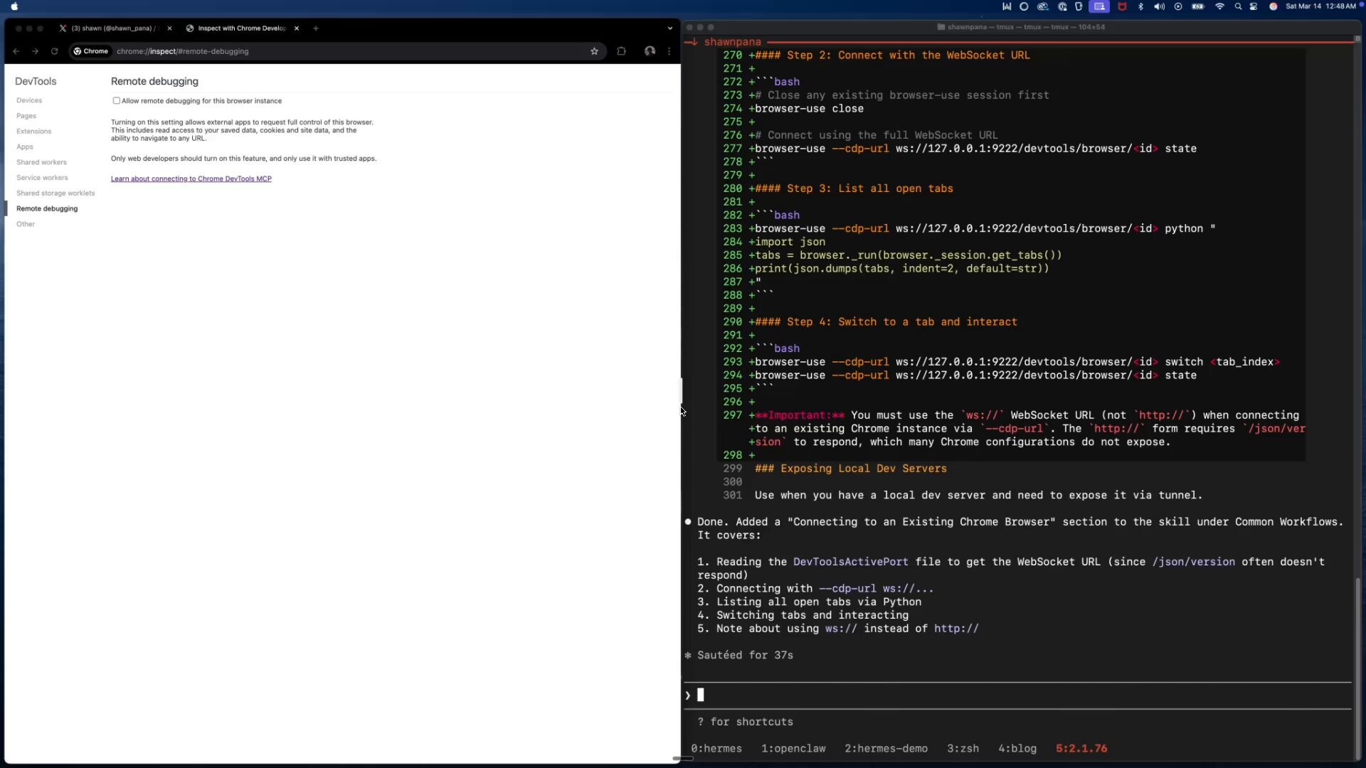 The implications cascaded quickly. @shawn_pana demonstrated connecting Claude Code directly to a browser session, calling it "insane" and noting that it eliminates the need for Chrome extensions entirely. @gregpr07, who builds Browser Use, simply stated "Chrome 146 is a huge unlock for web agents." @bromann from Typefully showed a practical application already in production: "I can now have a LangChain Deep Agent constantly browse through my X feed in the background and update a daily summary that I look at the end of the day instead of constantly scrolling through the app." @steipete immediately moved to add the capability to OpenClaw.