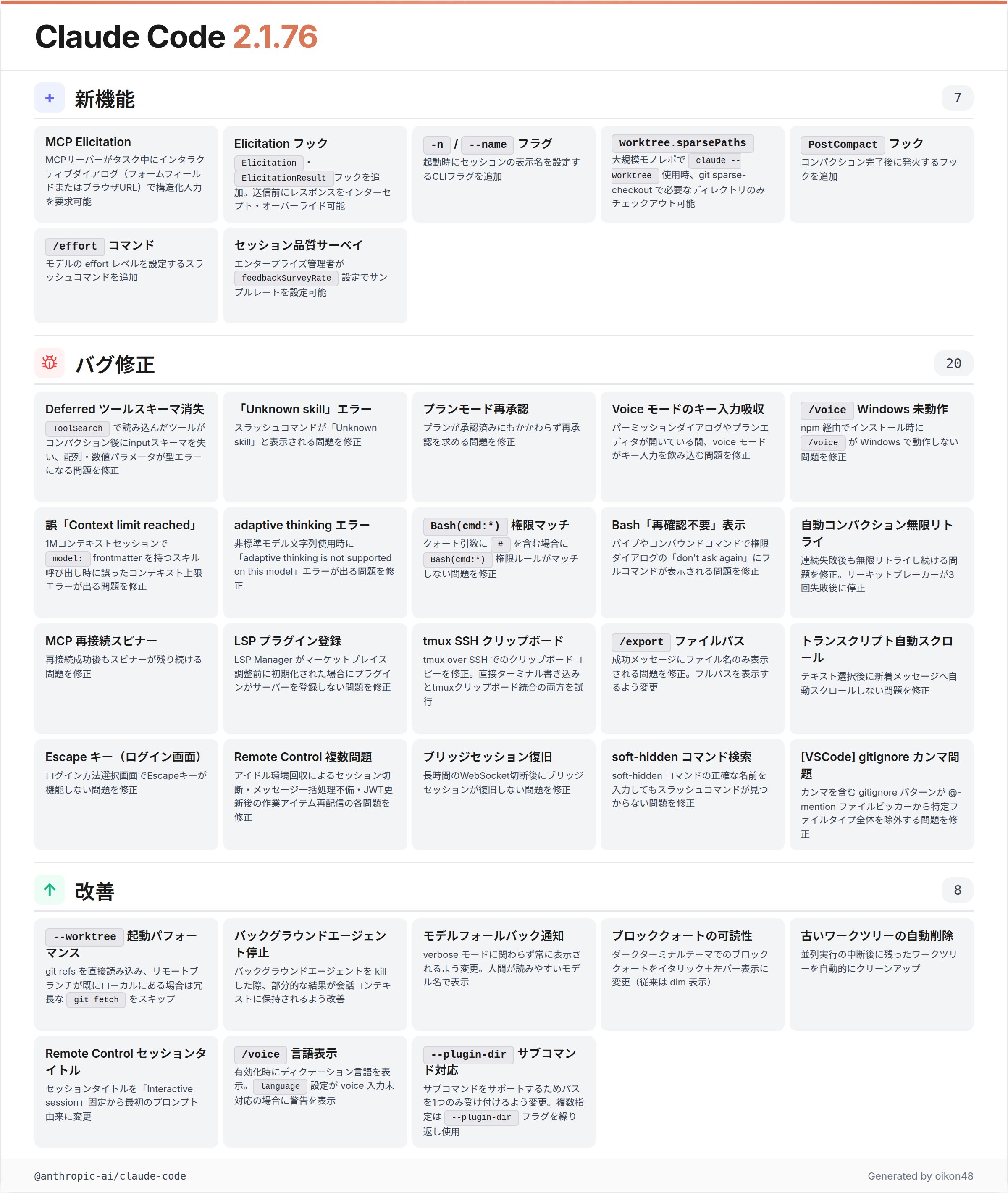 Claude Code 2.1.76 dropped with a substantial feature list. @oikon48 provided a detailed Japanese-language breakdown of the release, highlighting MCP Elicitation support as the headliner. The update also includes a -n/--name flag for naming sessions, worktree.sparsePaths for git sparse-checkout in large monorepos, a PostCompact hook, and an /effort command for adjusting model effort levels. Bug fixes addressed Windows voice support, permission rule matching with quoted # characters, and several Remote Control stability issues around session management and JWT refresh.