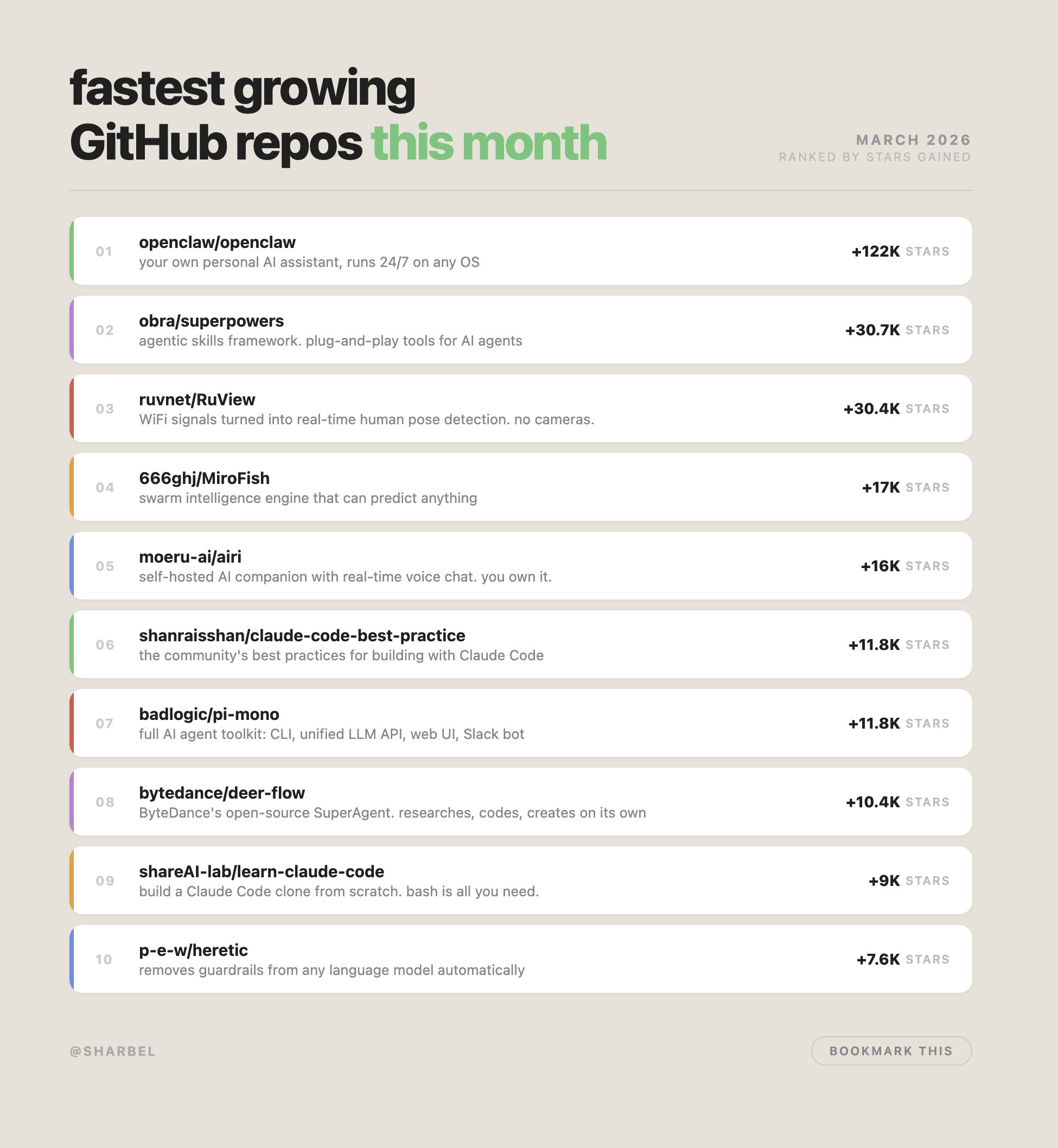 @sharbel compiled this month's fastest-growing GitHub projects, and the list reads like a snapshot of where developer energy is flowing. OpenClaw leads at 122K stars as a personal AI assistant. Superpowers hit 30.7K stars as a plug-and-play agent skills framework. But the more surprising entries tell a bigger story: RuView (30.4K stars) turns regular WiFi signals into real-time human pose detection with no cameras or sensors. MiroFish (17K stars) bills itself as a "swarm intelligence engine that predicts anything," and @k1rallik noted that its creator, a student, "outranked OpenAI on GitHub with 10 days of vibe coding." And then there's Heretic at 7.6K stars, which "removes guardrails from any language model automatically." The open-source AI ecosystem is moving fast enough that next month's list will look completely different.