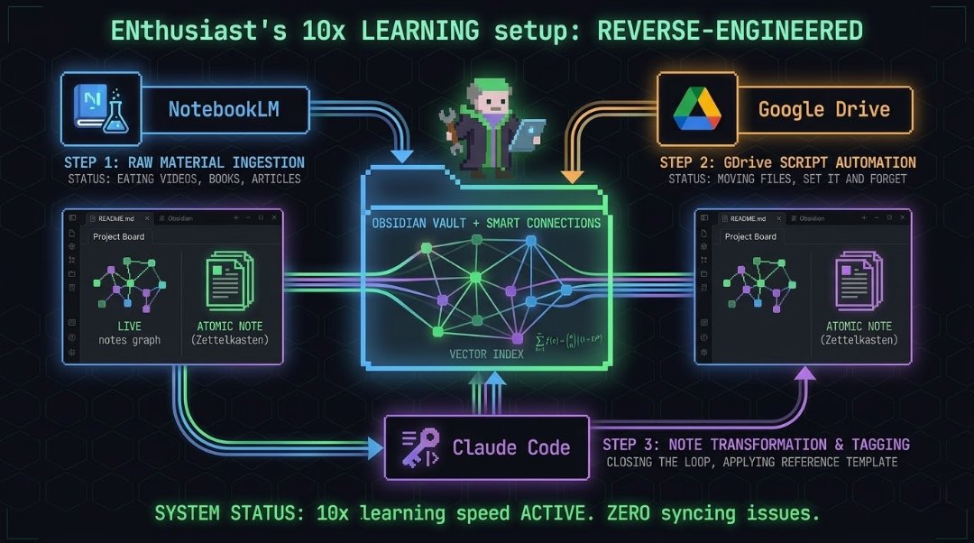 @Atenov_D published a detailed breakdown of a "10x learning speed" setup that chains NotebookLM, Google Drive, Obsidian with Smart Connections, and Claude Code into a continuous knowledge processing pipeline. The core insight is that breaking information into atomic notes (one idea per file, tagged and cross-linked) isn't just organization but is the learning itself: "When you open a note weeks later and see three related ideas you'd forgotten, that's active recall. That's what builds memory." Omar Khattab (@lateinteraction) retweeted a related project where someone used DSPy and RLM to automatically refactor a messy Obsidian vault. The pattern emerging here is that AI isn't just helping people consume information faster; it's restructuring how knowledge gets stored and retrieved in ways that compound over time.