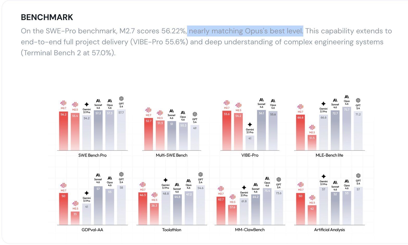 @arafatkatze provided additional context on the practical implications: "The Minimax-2.7 model blog describes how the agent literally runs and iterates training on its own. You could be a researcher who wants to prototype 4 different ideas... You run 4 of them in 4 parallel worktrees and ask the agent to write the code and parallelly run the training runs and then pick the best ideas that work." @cryptopunk7213 highlighted the competitive angle, noting the model matches Claude Opus 4.6 and GPT-5.4 on several benchmarks while running on modest hardware.