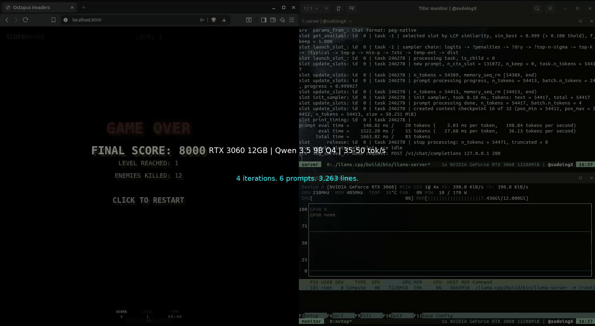 this is what 12 gigs of VRAM built in 2026. a 9 billion parameter model running on a 5 year old RTX 3060 wrote a full space shooter from a single prompt. blank screen on first try. i came back with a bug list and the same model on the same card fixed every issue across 11 files without touching a single line myself. enemies still looked wrong so i pushed another iteration and now the game has pixel art octopi, particle effects, screen shake, projectile physics and a combo system. all running locally on a card that was designed to play fortnite. three iterations. zero cloud. zero API calls. every token generated on hardware sitting under my desk. the model reads its own code, finds what's broken, patches it, validates syntax and restarts the server. i just describe what's wrong and it handles the rest. people are paying monthly subscriptions to type into a browser tab and wait for a server farm to respond. meanwhile a GPU you can find used on ebay is running a full autonomous hermes agent framework with 31 tools, 128K context window and thinking mode generating at 29 tokens per second nonstop. the game still needs work. level upgrades don't trigger and boss fights need tuning. but the fact that i'm iterating on gameplay balance instead of debugging whether the code runs at all tells you where this is headed. every iteration the game gets better on the same hardware. same 12 gigs. same 9 billion parameters. same RTX 3060 from 5 years ago your GPU is not a gaming card anymore. it's a local AI lab that never sends your data anywhere.