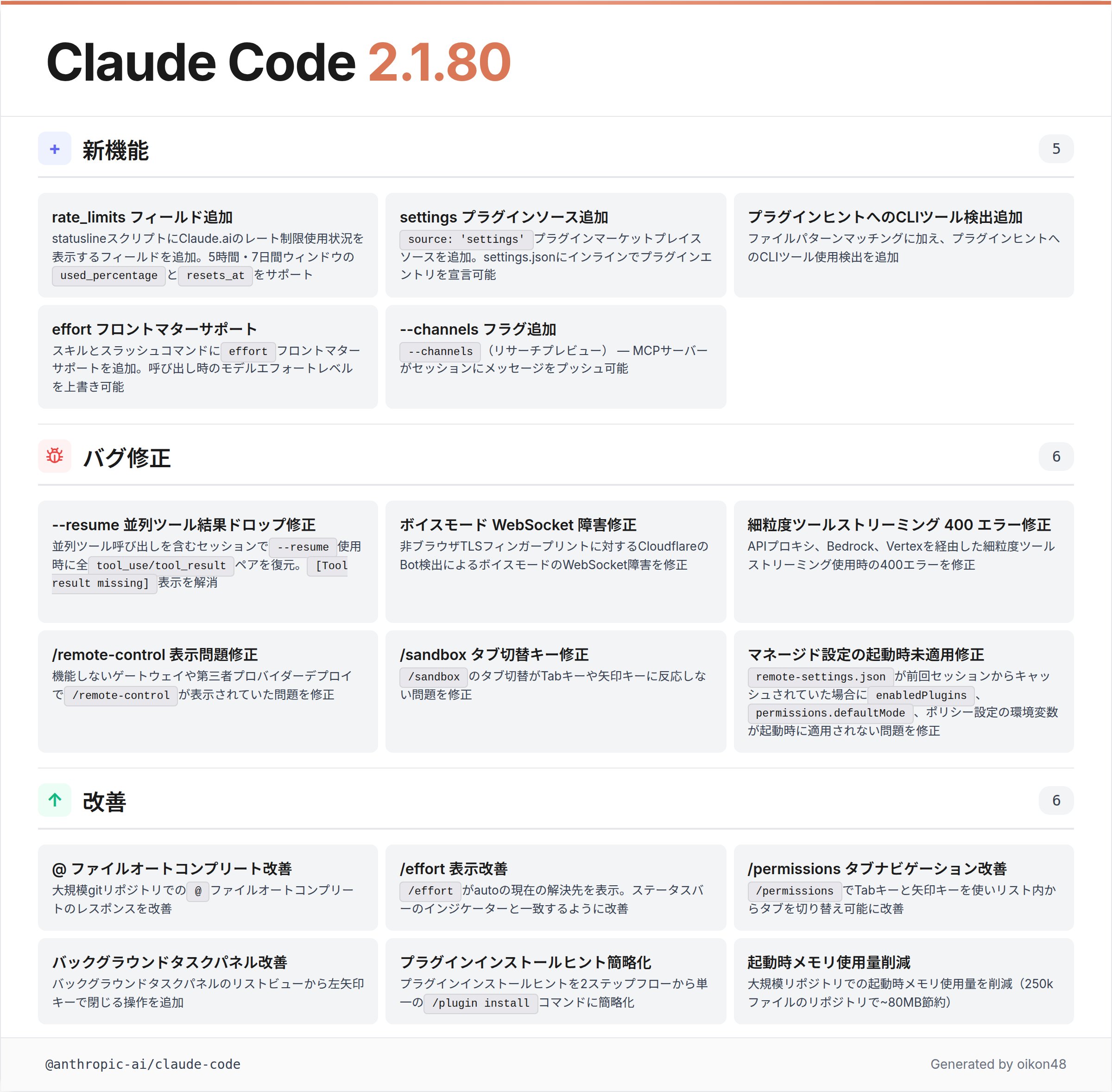 - @oikon48 broke down Claude Code 2.1.80's changelog in Japanese, highlighting rate limit visibility in the status line, plugin marketplace additions, effort overrides in skill frontmatter, and ~80MB memory reduction for large repos.