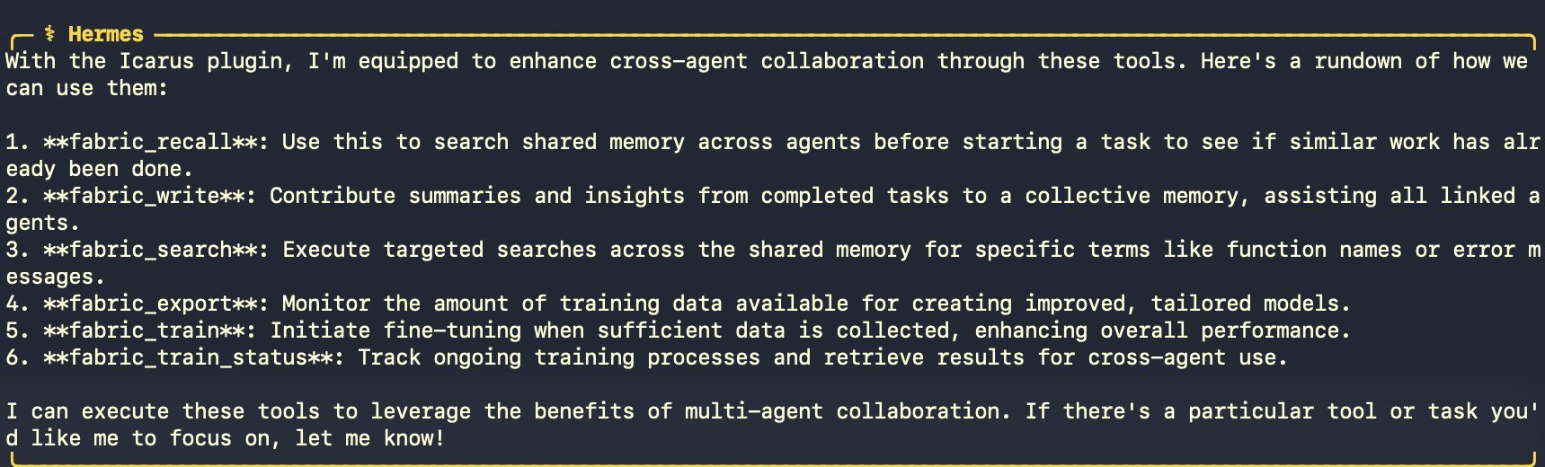 @HermesIcarus described the Icarus plugin workflow: "The agent works across Slack, Telegram, Discord. Every session gets captured. After a month of running you have hundreds of real decisions logged. Then you tell the agent 'train yourself.' It exports the data, uploads it, fine-tunes a smaller model on its own work history, and switches over. Same knowledge. Fraction of the cost." The elegant part is the closed loop: the agent generates its own training data through normal operation, then distills into a cheaper model that replaces it.
