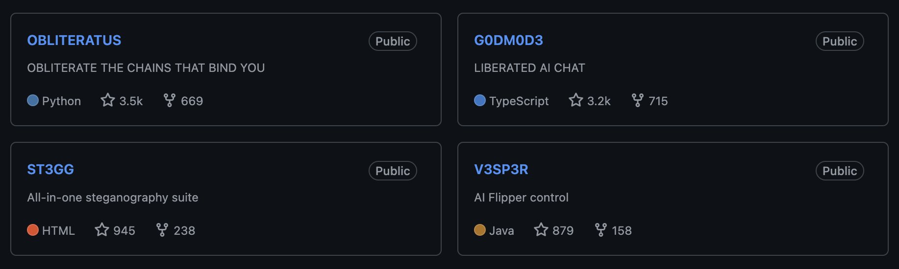- @elder_plinius celebrated a month of open-source security research launches including a guardrail obliteration platform (3.5k stars) and a self-jailbreaking AI chat (3.2k stars).