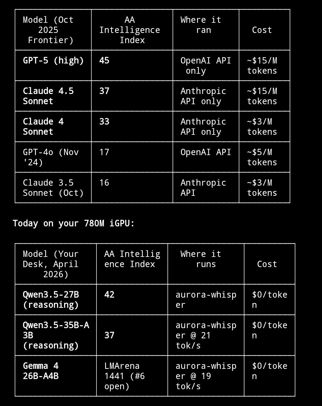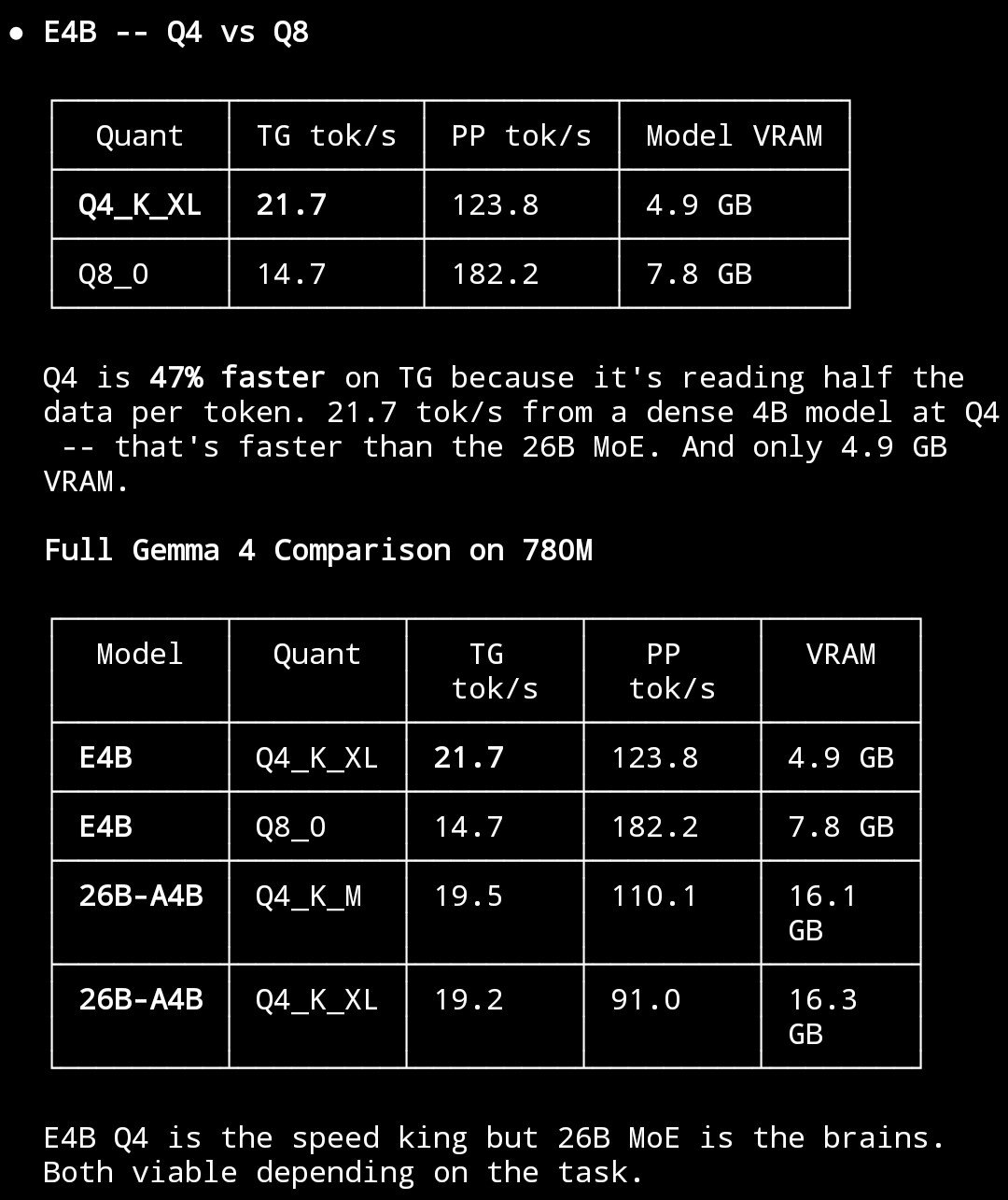 @basecampbernie published an exhaustive breakdown of running 26B parameter models on a $300 Minisforum mini PC: "The secret: the 780M has no dedicated VRAM. It shares your DDR5 via unified memory... I'm allocating 21+ GB for model weights on a GPU with '4GB VRAM.'" The key insight is that Mixture of Experts architectures only activate a fraction of parameters per token, making DDR5 bandwidth sufficient. Gemma 4 26B runs at 19.5 tok/s, Qwen3.5-35B at 20.8 tok/s. Dense models hit a bandwidth wall at 4 tok/s, but MoE delivers equivalent quality at 5x the speed.