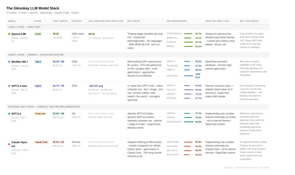 But the most substantive response came from @gkisokay, who laid out a complete multi-model architecture that was already insulated from exactly this kind of platform risk. His stack runs Qwen3.5 9B locally for free ideation loops, MiniMax M2.7 as the agent backbone at $0.30 per million tokens, and GPT-5.4 mini for orchestration at roughly $0.075 per run. Over 24 hours his subconscious agent loop ran 15 times for $1.58 total. "The lesson is to build your agent stack on a multiple LLM stack," he wrote. "Local models handle volume. Generous subscription models handle execution and judgment. You own the cost structure." This is the direction the ecosystem has been heading for months, and today's ban just accelerated the timeline.