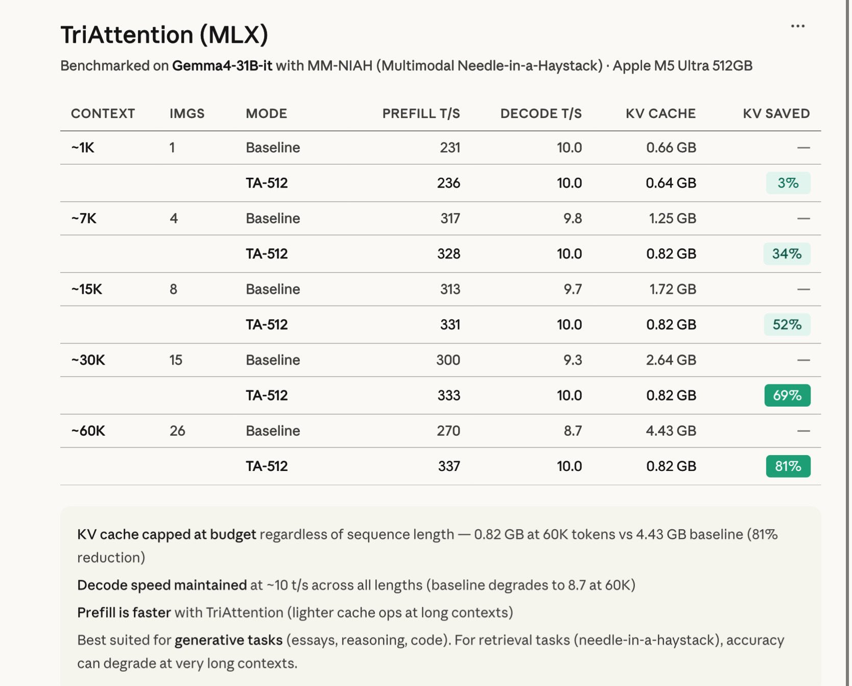 This pairs naturally with @Prince_Canuma's implementation of TriAttention in MLX, which achieved 81% KV cache compression at 60K tokens on Gemma-4-31B. The benchmarks are striking: KV cache stays capped at 0.82 GB regardless of context length, and decode speed actually improves over baseline at long contexts. The caveat that it works better for generative tasks than retrieval is worth noting, but for reasoning and code generation workloads, this is a significant efficiency gain.