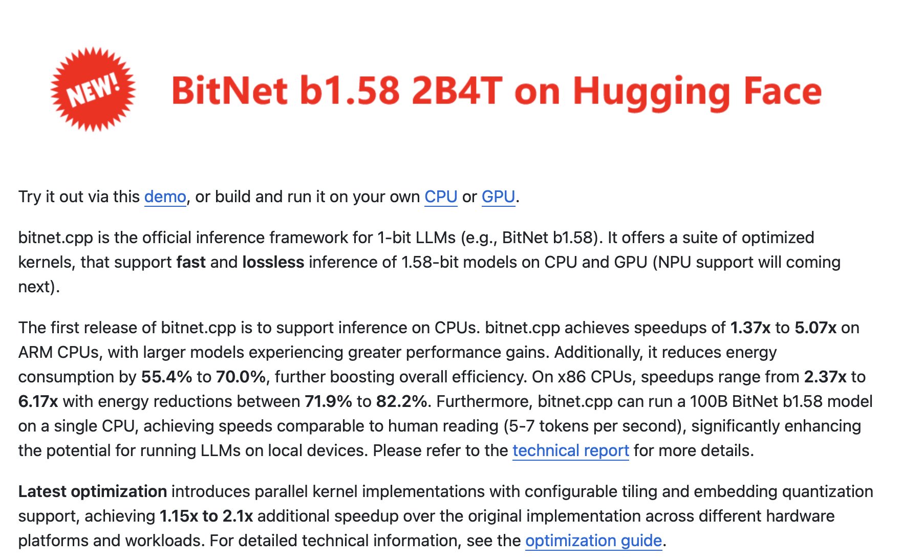 Microsoft's BitNet.cpp update landed with a splash, and @outsource_ laid out the numbers: 100 billion parameter models running on CPU alone at human reading speed (5-7 tokens per second), with 82% lower energy usage and 6.17x faster inference on x86. Built on llama.cpp with full GGUF support, this isn't a research demo. It's a shipping framework.