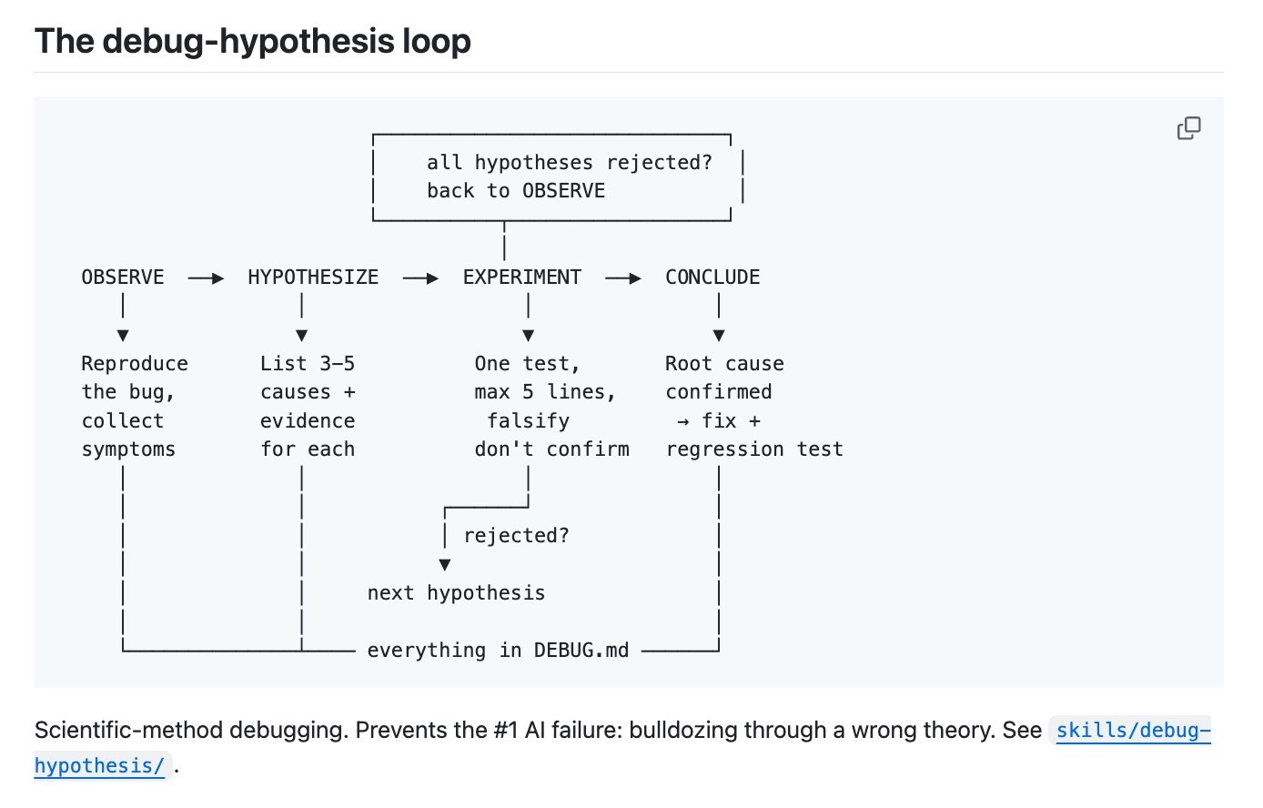 The AI listed five hypotheses. The third had no contradicting evidence. "3 lines of experiment, root cause confirmed, 5-minute fix." The resulting methodology is deceptively simple: "List hypotheses before changing code. Each experiment changes at most 5 lines. Write all evidence to a file to prevent context compression from losing the reasoning chain. If the same direction fails twice, force a hypothesis switch." This has been open-sourced as a Claude Code and Gemini CLI skill. The insight here isn't about AI at all. It's about applying scientific method to debugging, something humans have always been bad at, and using the AI's tendency toward structured output as an advantage rather than fighting it.