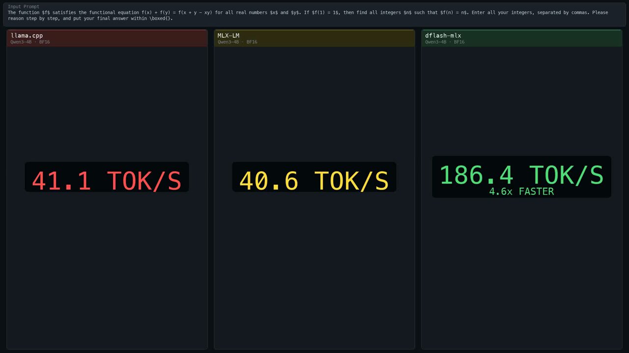 The economics of running AI continue to shift in surprising ways. @aryagm01 announced dflash-mlx, a port of DFlash speculative decoding to Apple Silicon that achieves "Qwen3-4B at 186 tok/s on a MacBook, 4.6x faster than plain MLX-LM" with exact greedy decoding, meaning output matches plain target decoding perfectly. This isn't an approximation or a quality tradeoff. It's pure speed.