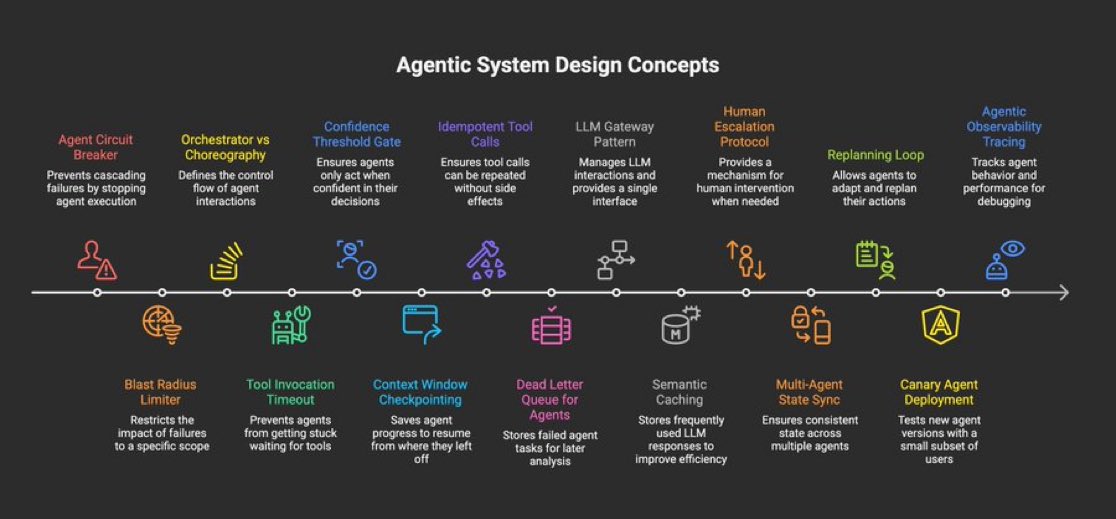 @asmah2107 laid out a 15-point checklist of agentic system design concepts that reads like a distributed systems textbook adapted for LLMs: "Agent Circuit Breaker, Blast Radius Limiter, Orchestrator vs Choreography, Tool Invocation Timeout, Confidence Threshold Gate, Context Window Checkpointing, Idempotent Tool Calls, Dead Letter Queue for Agents." Every one of these maps to a failure mode that anyone who's shipped an agent has encountered. The list is notable not for any single item but for how comprehensively it covers the gap between "agent that works in a demo" and "agent that works at 3 AM on a Saturday."