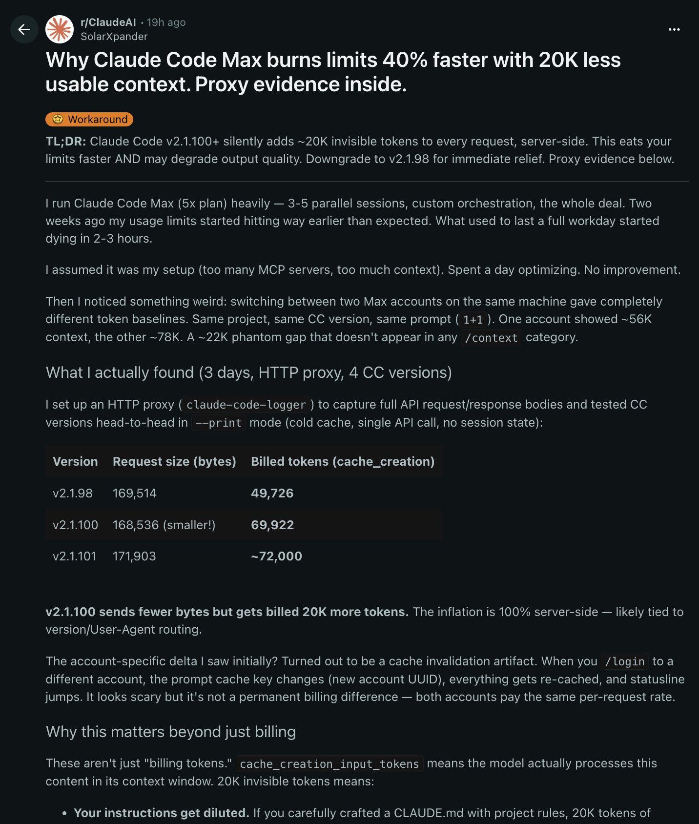 @om_patel5 published what he calls proof of invisible token inflation: "v2.1.98: 49,726 billed tokens. v2.1.100: 69,922 billed tokens. Same project, same prompt, same account." His analysis claims these additional tokens are entirely server-side and invisible to users, meaning "your CLAUDE.md instructions get diluted by 20K tokens of hidden content" and "quality degrades faster in long sessions." His recommended fix is blunt: "downgrade to v2.1.98." Whether or not the full interpretation holds up, the methodology of proxying API requests to audit billing is valuable and likely to be replicated.