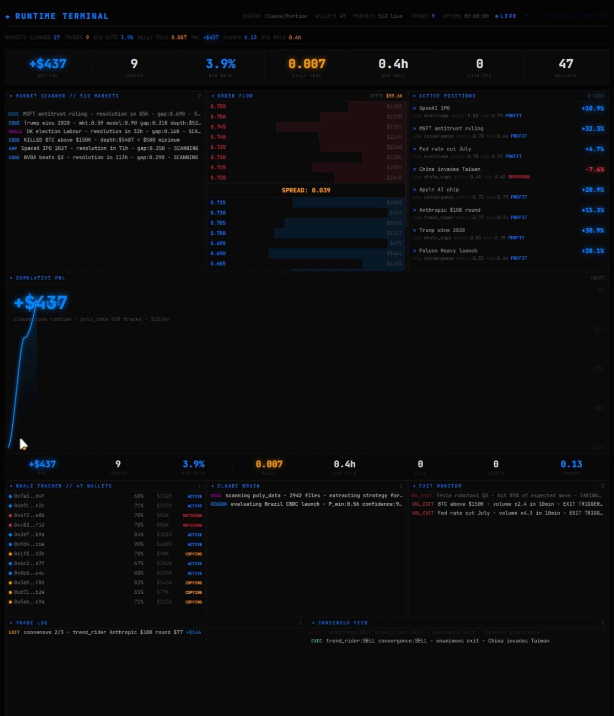 @LunarResearcher's viral thread about building a Polymarket trading bot with Claude Code reads like fiction but maps to real tools and repos. The core claim: connecting Claude Code to Polymarket's 86 million trade dataset, identifying 47 wallets with 70%+ win rates, and building a scanner that filters 500+ markets in real time. The key insight buried in the thread is about exits, not entries: "Same exact entries. The exits make it a completely different game." Top wallets capture 86% of the expected move and cut losers at 12%, while everyone else holds losers to 41%. Whether the claimed $8,700 return on an $800 seed is real or embellished, the underlying architecture of using AI as a runtime for data analysis rather than a chatbox for generating prompts reflects a broader shift in how people think about these tools.
