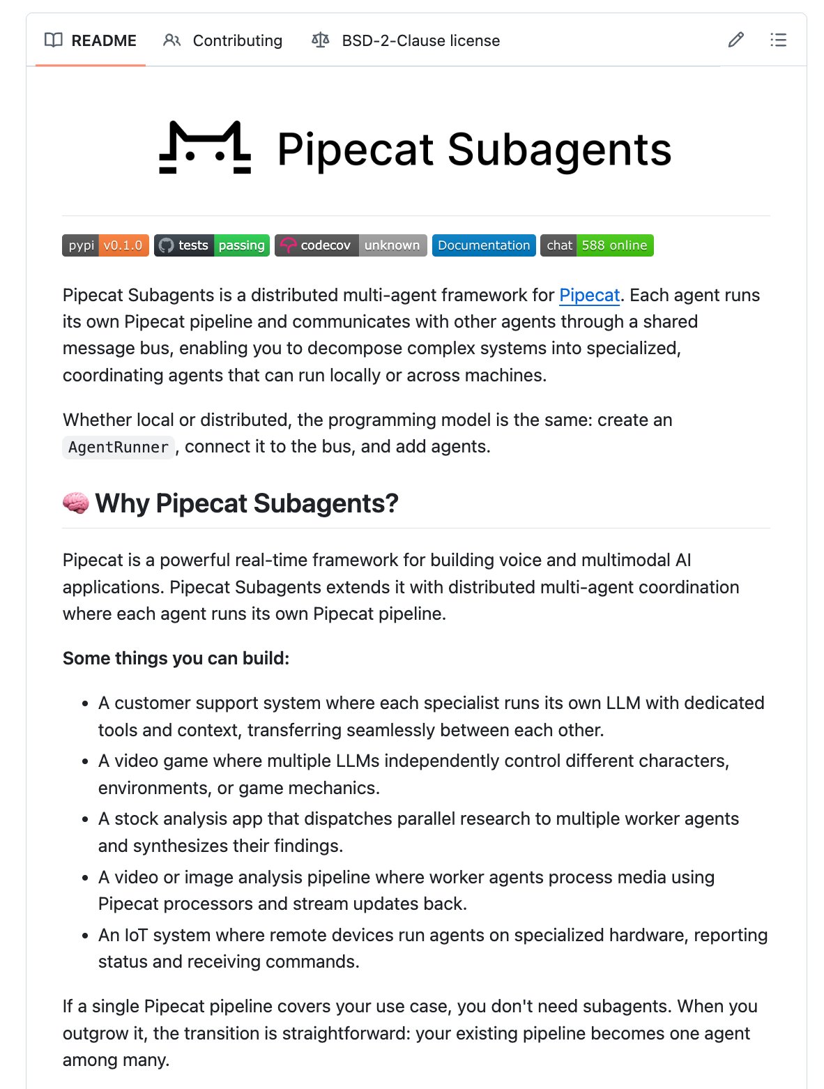 The agent infrastructure conversation leveled up today with three distinct but complementary developments. @kwindla announced Pipecat 1.0 after two years of development, positioning it not just as a voice agent framework but as a general-purpose platform for "realtime, multi-modal, multi-model AI applications." The launch came alongside Pipecat Subagents, a library for running multiple inference loops in parallel with partially shared context. The fact that they proved the architecture by building Gradient Bang, described as "the first massively multiplayer, completely LLM-driven game," suggests the framework handles real complexity, not just demo-day scenarios.